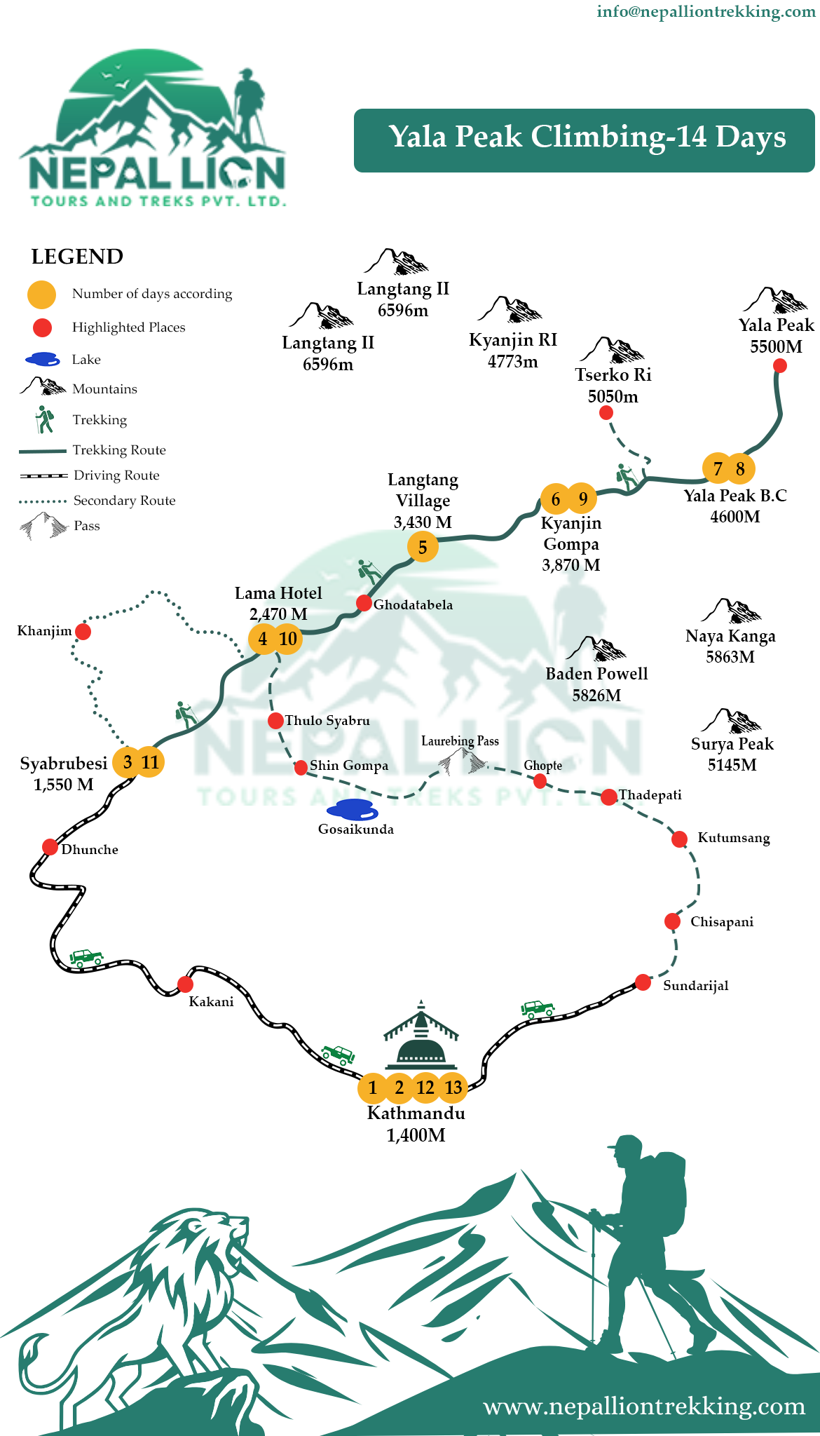 The Yala Peak expedition typically takes 12–14 days, depending on your pace and acclimatization needs.